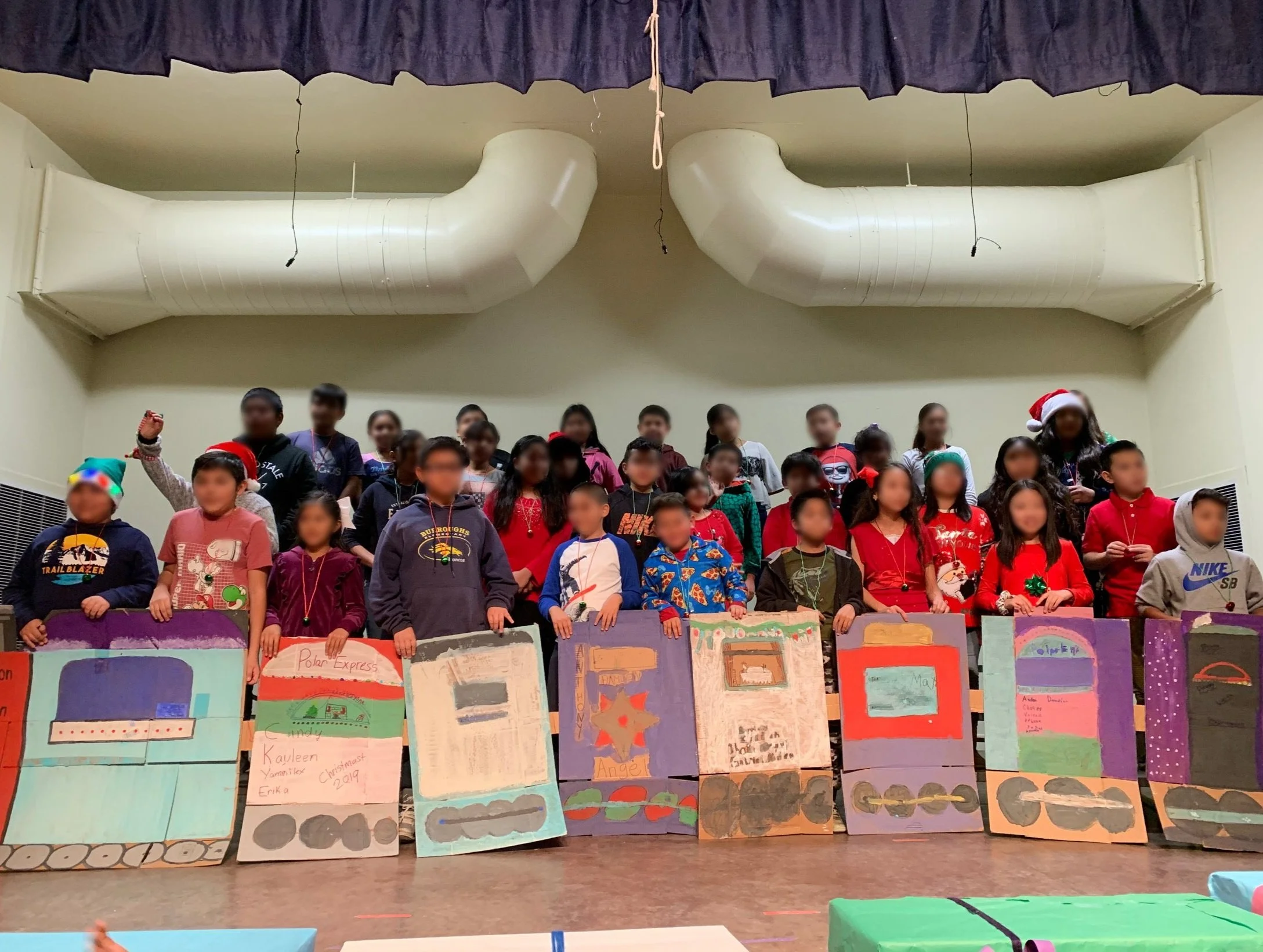 In 2019, I worked with an after school program at John Burroughs elementary school. I had my own class of 21 fifth graders. I wrote and taught my own lesson plans along with subject related art enrichment activities. This photo shows my fifth grade group alongside a fourth grade group performing at our winter showcase. We rehearsed and performed a song for parents and other communities members and our students made their own props, pictured here.